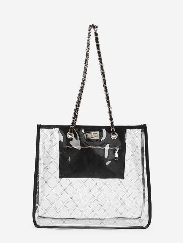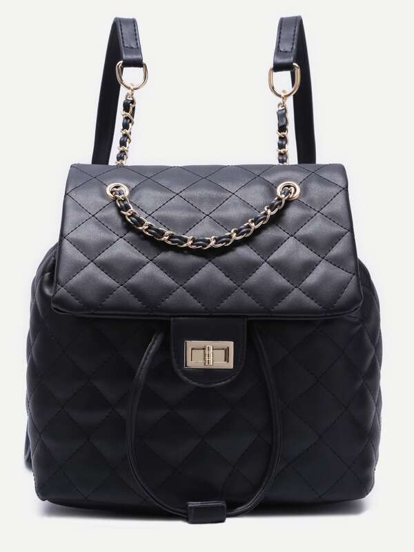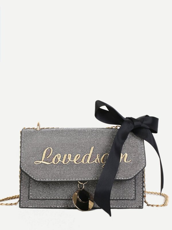 Bow Tie Letter Embroidered Chain Bag | Quilted Tote Bag With Chain Handle | Black PU Quilted Flap Drawstring Backpack